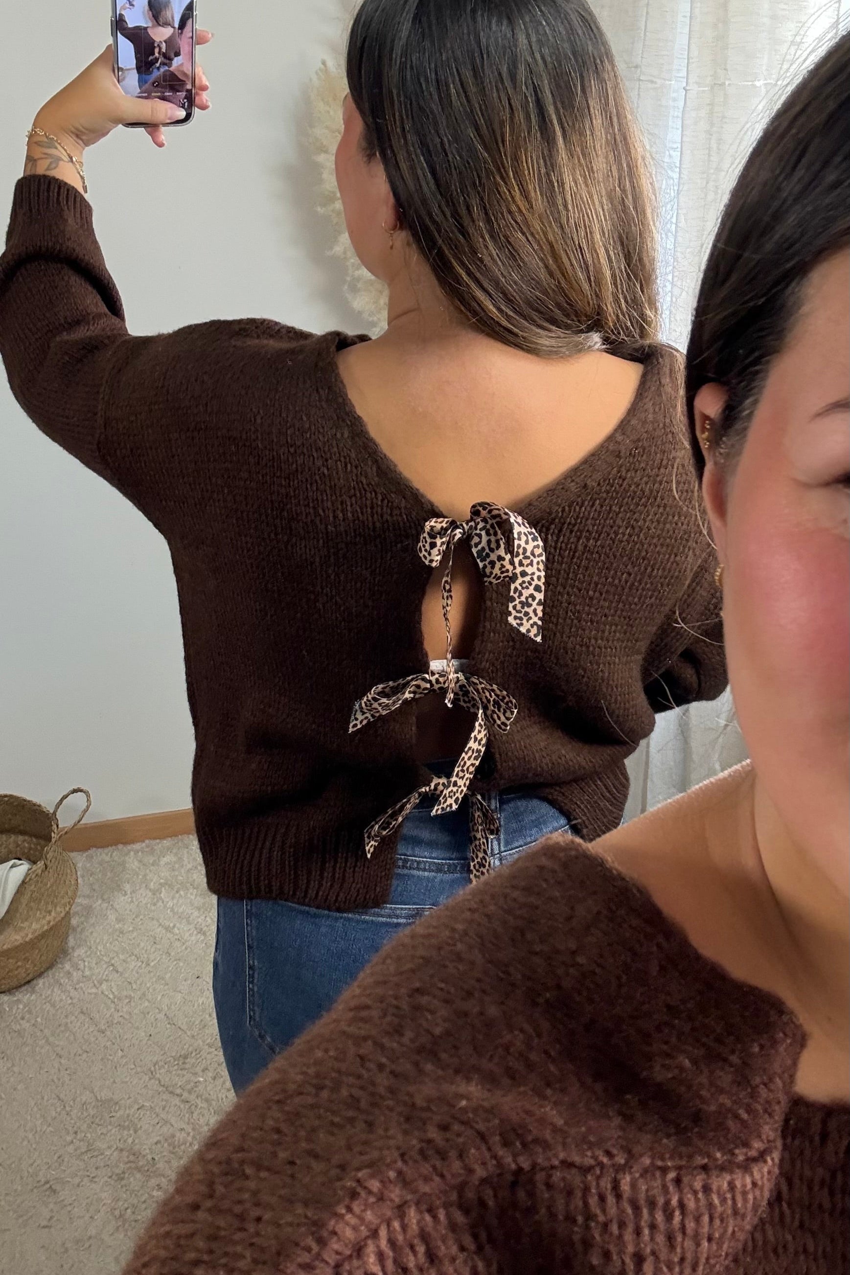 À l’avant, ses nœuds délicats lui donnent une touche féminine et originale, parfait pour être porté ouvert sur un top ou fermé comme un gilet. À l’arrière, il dévoile un dos nu élégant et moderne qui sublime ta silhouette quand tu le portes façon pull.