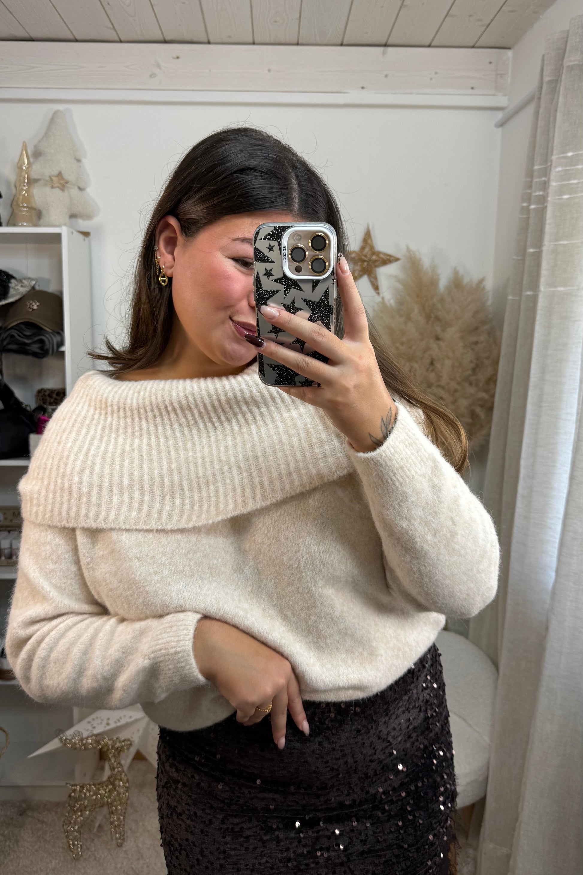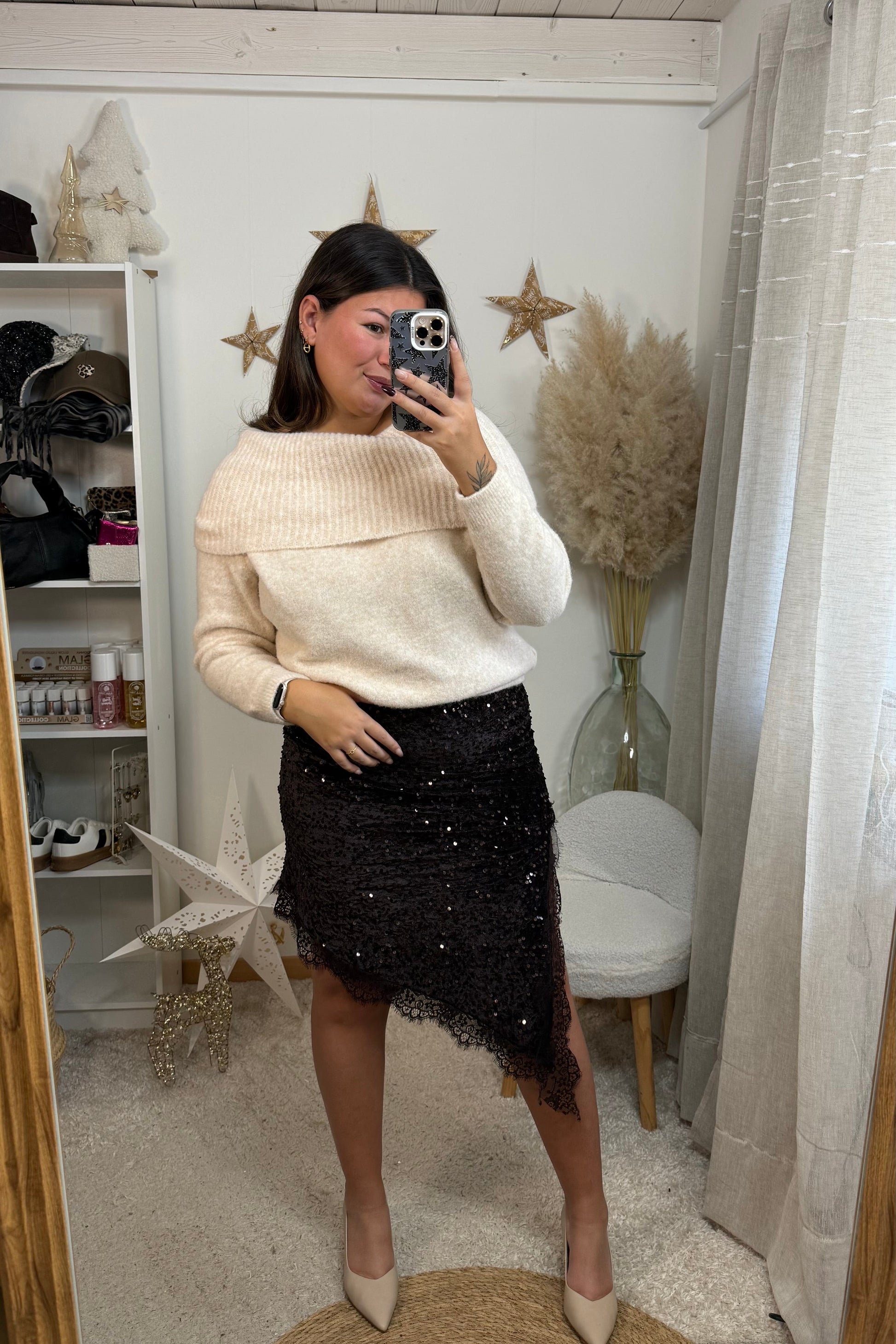 Porte-le avec un jean taille haute ou un pantalon wide leg pour un look chic et effortless. Pour une vibe plus féminine, associe-le à une jupe satinée et des bottines. Ajoute des bijoux dorés pour mettre en valeur le col bateau, et un manteau long camel pour un outfit ultra élégant.
